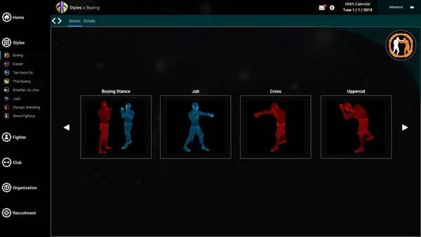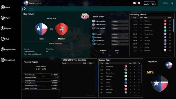В процессе игры вы будете заниматься подбором бойцов, планированием тренировочного процесса, подписывать контракты с перспективными спортсменами и искать спонсорские соглашения. В MMA Team Manager реализован максимально реалистичный игровой процесс, который помогает ощутить всю жестокость и тактику октагона. Обучайте своих бойцов, изучайте их соперников, меняйте тактики и ищите слабые стороны противников, чтобы одержать победу в зрелищных поединках. В игре представлено более 100 клубов со всего мира, что делает игровой процесс еще более увлекательным и разнообразным.