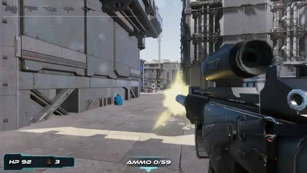 Интерфейс в Cybershow максимально простой и минималистичный: снизу слева отображаются здоровье и гранаты, сверху – выбранное оружие, а на экране постоянно виден счётчик патронов — всё, чтобы геймер мог сосредоточиться на бою и не отвлекаться на лишние элементы управления. В процессе прохождения можно искать тайники с новыми видами оружия и аптечками, что значительно увеличивает шансы на успех и выживание в этом опасном научно-фантастическом мире.