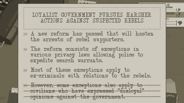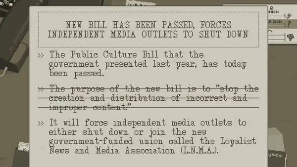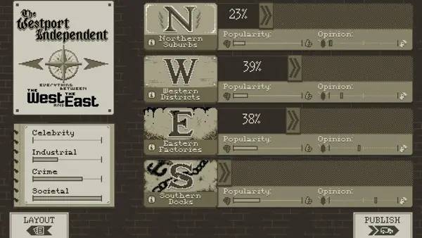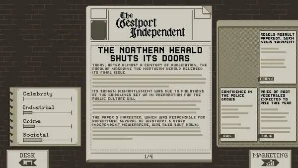 В роли редактора газеты вам предстоит балансировать между правдой и цензурой, выбирая подходящие материалы для публикации. В процессе игрового процесса вы столкнетесь с разными группами — повстанцами, требующими освещения их борьбы, и правительственными лоялистами, стремящимися закрыть глаза на любые мятежи. Своими решениями вы повлияетe на общественное мнение и судьбу страны, выбрав определенные статьи для публикации или полностью исключив опасные материалы. В игре поднимаются важные темы, такие как здравоохранение, протестные движения и социальное напряжение, что делает ее насыщенной и актуальной.