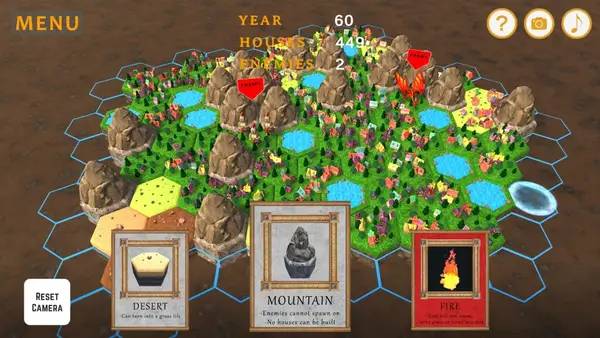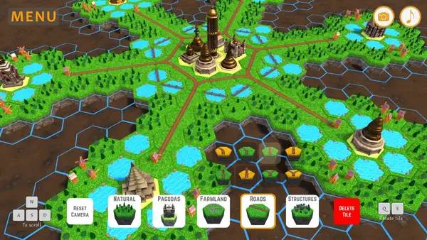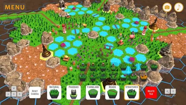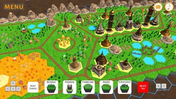 Игровой процесс включает в себя следующие ключевые моменты: настройку режима по длительности (30, 50 или 100 раундов), случайную генерацию начальных 5 плиток для разнообразия уровней, а также создание красивых поселений, где можно выставлять желаемые сооружения и экспериментировать с размещением.