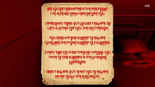 В игре вас ждет множество головоломок и испытаний, решение которых поможет выбраться из этого загадочного и опасного места. Все события начинаются с того, что главный герой исследует сайт deepweb, где натыкается на сайт под названием Redroom. В тот момент экран тускнеет и покрывается красным цветом, после чего вас похищают. Очнувшись в незнакомом месте, вы неожиданно осознаете, что находитесь в одной и той же комнате, которая будто бы повторяется бесконечно. Важным аспектом играть становится внимательность — именно она поможет обнаружить необходимые подсказки для продолжения пути. В игре доступно восемь зашифрованных подсказок, собрав которые, вы получите восьмизначный код, напоминающий номер мобильного телефона. Его правильное введение позволит вам сбежать из заколдованного места.