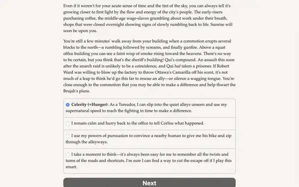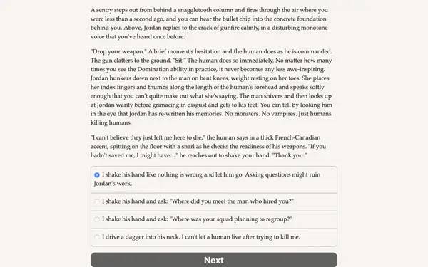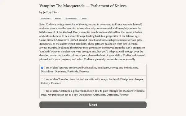 Основной стиль геймплея — текстовое повествование, которое позволяет полностью сосредоточиться на диалогах, постановке решений и их последствиях, избегая отвлекающих графических эффектов. Такой формат делает игру особенно привлекательной для игроков, предпочитающих интеллектуальные вызовы и глубокий сюжет. В центре внимания — борьба за власть внутри вампирского сообщества, где каждый шаг диктуется не только логикой, но и тонкой политической игрой.