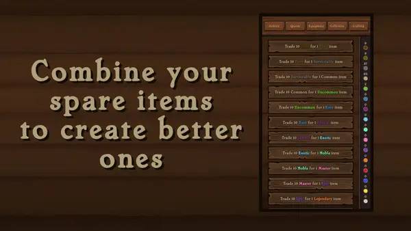 Геймплей включает работу с 13 типами предметов, разделённых на 16 уровней по силе. Встроенная система крафта позволяет объединять найденные предметы для создания более мощной экипировки, что стимулирует постоянное улучшение снаряжения в процессе игры. Для любителей соревновательного режима реализован встроенный таймер, который поддерживает быстрые забеги и соревнования на время, добавляя азарт и динамику в игровой процесс.